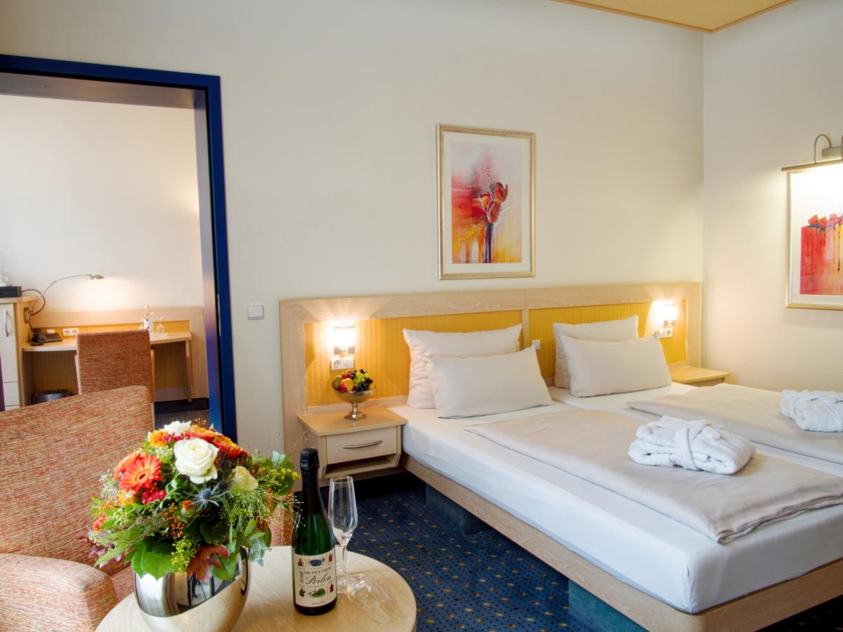 Our large deluxe rooms have a size of approx. 24 m², they are located towards the rear of the hotel and have a large bath room en suite with a walkin shower, hairdryer and a magnifying mirror.